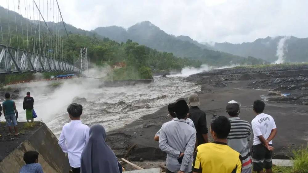 Warga melihat material lahar Gunung Semeru yang mengalir di Kali Regoyo, Desa Sumberwuluh, Candipuro, Lumajang, Jawa Timur (Foto: BPBD )